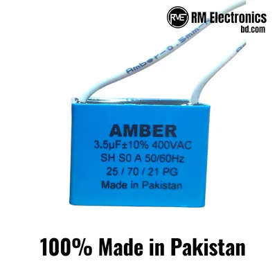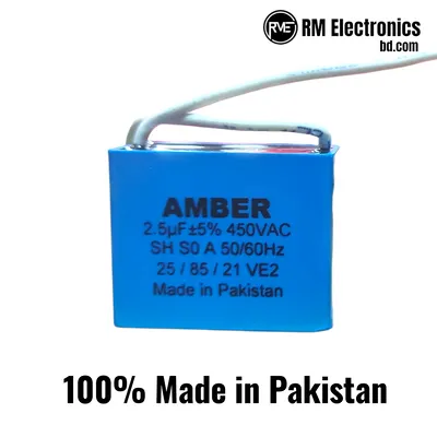 Amber Pakistani Ceiling Fan Capacitor – Restore your ceiling fan’s original speed with the genuine Amber Capacitor made in Pakistan. Available in two specific motor-run variants: 2.5 uF (450VAC) for standard speed and 3.5 uF (400VAC) for high torque requirements. Both feature self-healing (SH) technology and fire-retardant casing.